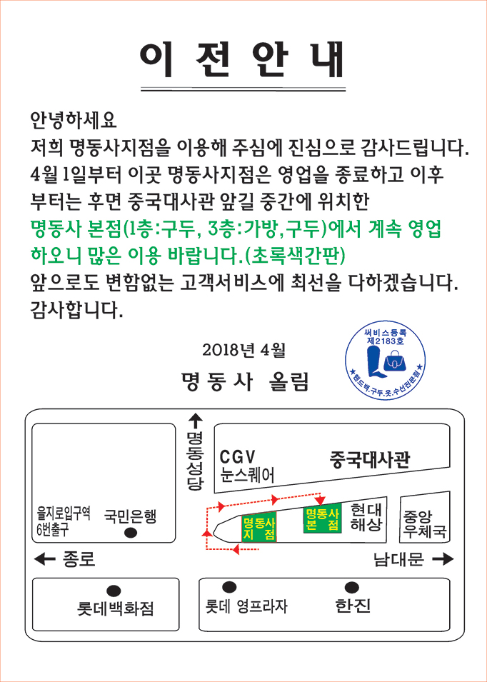 ±× µ¿¾È ½Å¼¼°è¹éÈÁ¡º»°ü(¸íǰ°ü) 5Ãþ¿¡ À§Ä¡ÇÑ "¸íµ¿»ç"¸¦ ÀÌ¿ëÇØ ÁֽŠ°í°´´Ô²² Áø½ÉÀ¸·Î °¨»ç¸¦ µå¸³´Ï´Ù. ½Å¼¼°è¹éÈÁ¡ ¸íǰ°ü 5ÃþÀÇ "¸íµ¿»ç"´Â ¹éÈÁ¡Ãø »çÁ¤À¸·Î ÀÎÇÏ¿© 2011³â12¿ù31ÀÏ ±îÁö¸¸ ¿µ¾÷ÇÏ¿À´Ï ³Î¸® ¾çÇØ ¹Ù¶ó¿À¸ç, ÀÌÈÄ 2012³â1¿ù1ÀÏ ºÎÅÍ´Â Áß¾Ó¿ìü±¹(Æ÷½ºÆ® Ÿ¿ö) µÚ Áß±¹´ë»ç°ü ¾Õ±æ¿¡ À§Ä¡ÇÑ "º»Á¡"(º»Á¡ ¿À½Ã´Â±æ ÂüÁ¶:¹é¾Ï¿Õ¼ø´ë±¹Áý 3Ãþ ¸íµ¿»ç)À¸·Î ¹æ¹®ÇÏ¿© ÁÖ½Ã¸é °è¼ÓÇØ¼ ¼º½É¼ºÀDz¯ °í°´´ÔÀ» ¸ð½Ã°Ú½À´Ï´Ù. ¶ÇÇÑ Á¾Àü ·Ôµ¥¹éÈÁ¡ ¿¡ºñ´º¿¤3Ãþ "¸íµ¿»ç"¸¦ ÀÌ¿ëÇϽôø °í°´ºÐ²²¼µµ °è¼ÓÇØ¼ "¸íµ¿»çº»Á¡"À» ÀÌ¿ëÇØ ÁÖ½Ã¸é °¨»çÇϰڽÀ´Ï´Ù.